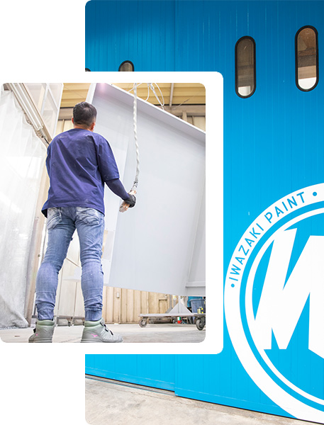 岩﨑塗装の工場内には空調を完備し乾燥多湿の季節にかかわらず品質を均一に保てる充実した設備と、丁寧なマスキング作業はすべて手作業による熟練の技術で貴社のニーズにお応えいたします。